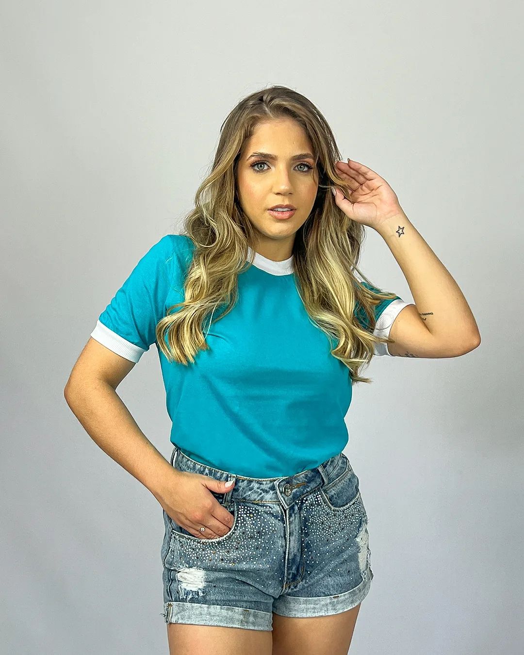 ♦ T-Shirt Feminina, costura ombro a ombro, reforçada na gola.